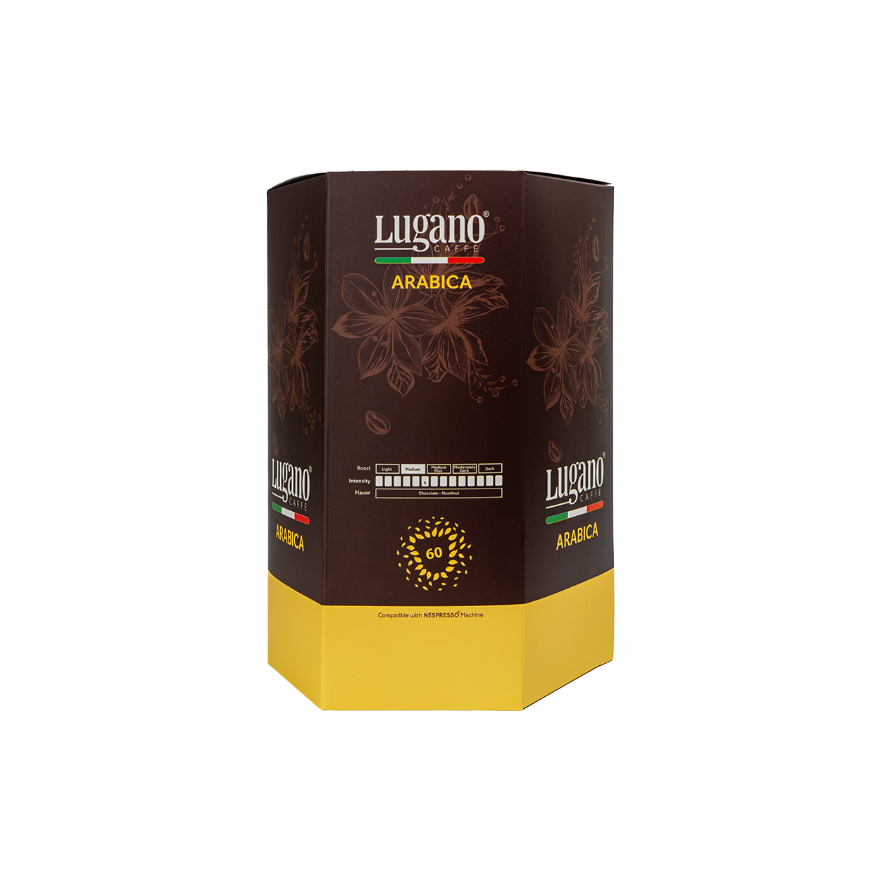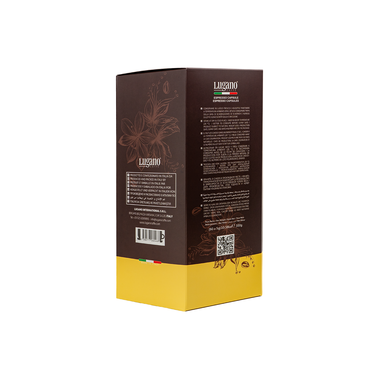 Lugano Caffè Arabica Espresso Capsules are 100% crafted primarily from premium Arabica coffee beans, resulting in a smooth and sweet flavor.