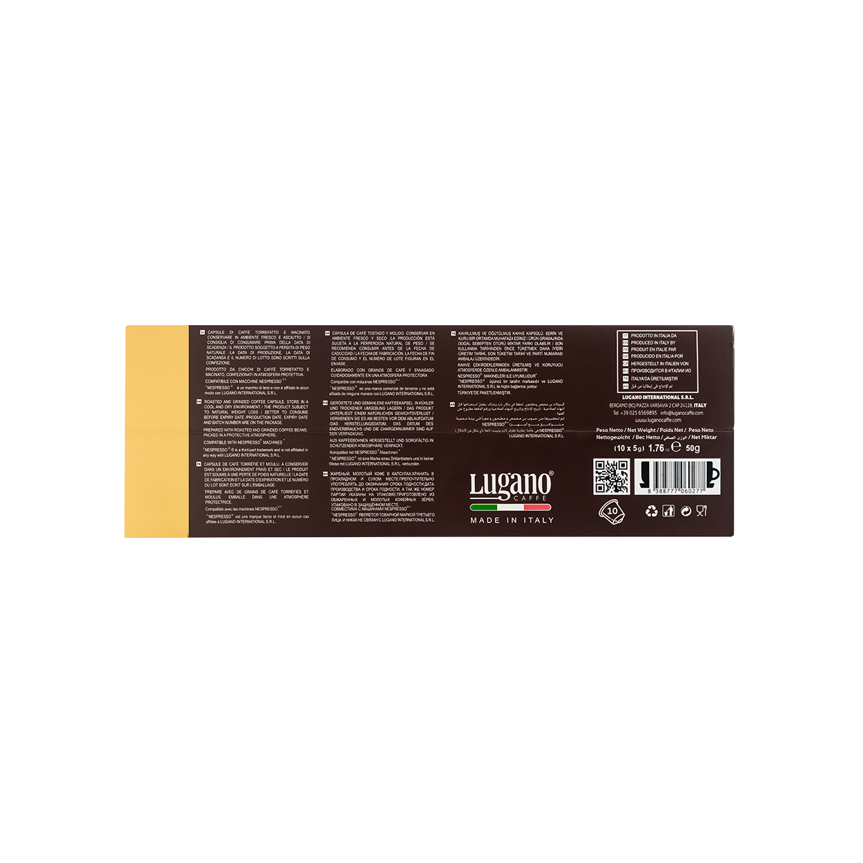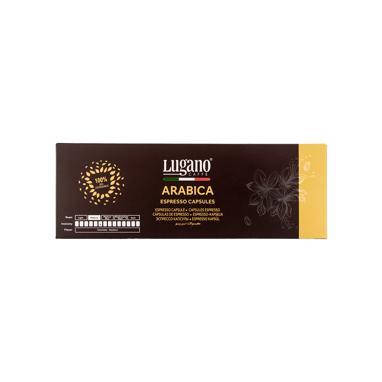 Lugano Caffè Arabica Espresso Capsules are 100% crafted primarily from premium Arabica coffee beans, resulting in a smooth and sweet flavor.