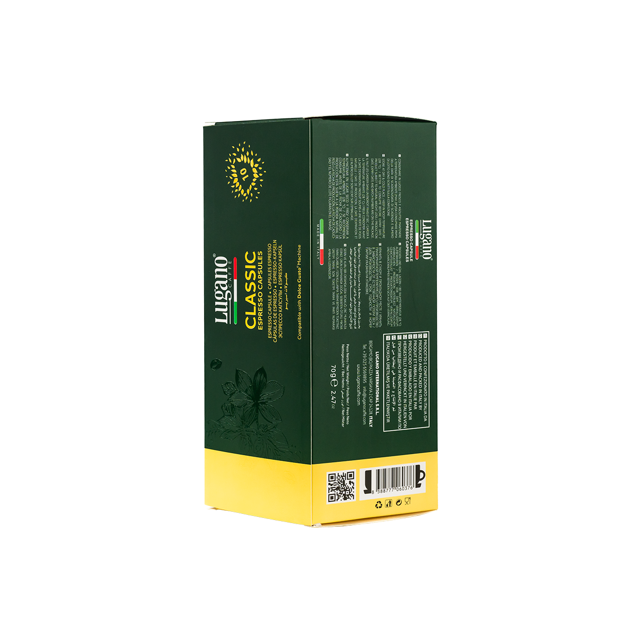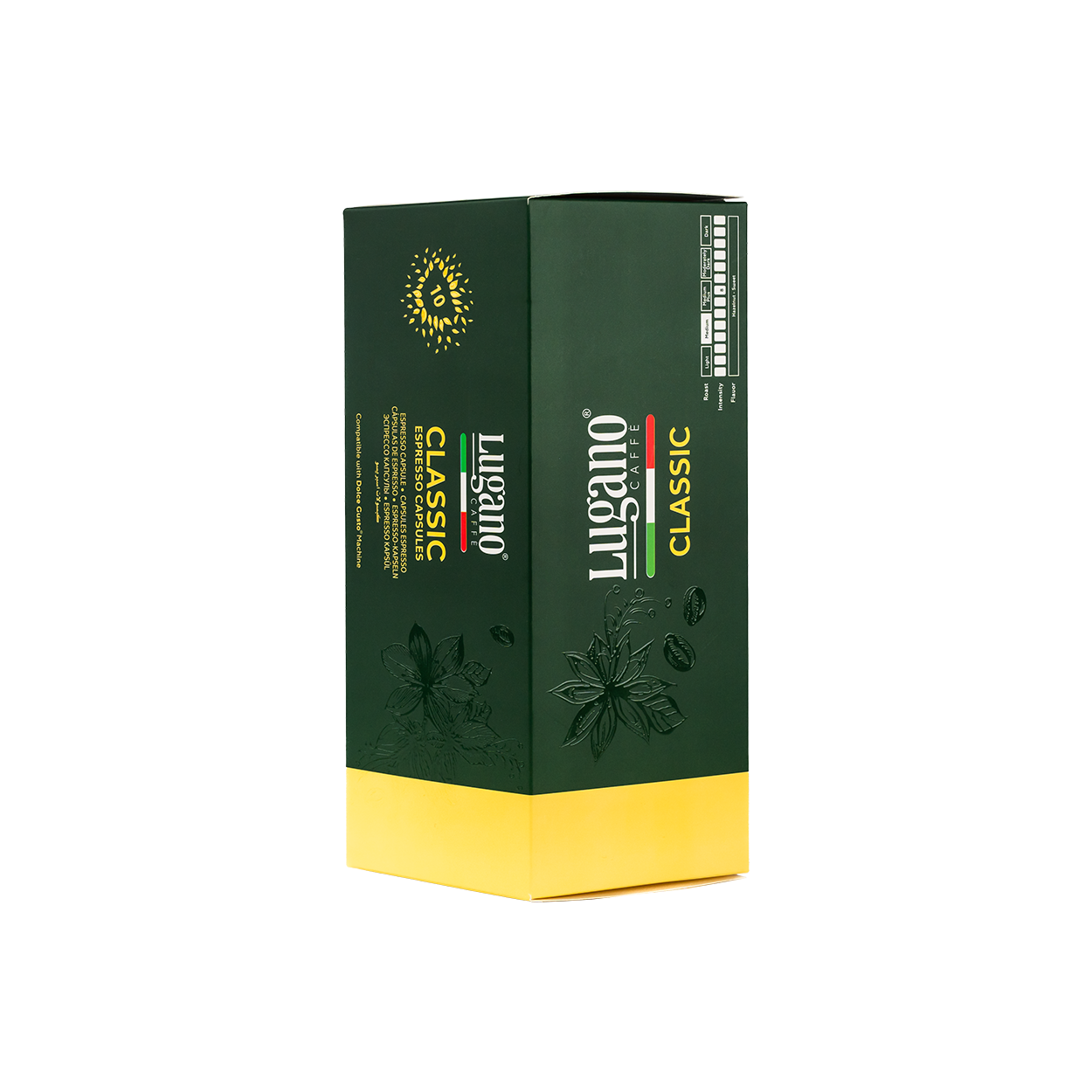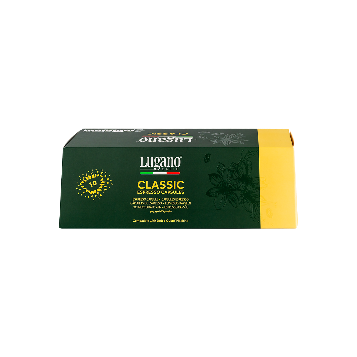 Lugano Caffè Classic Dolce Gusto Compatible Espresso Capsules have a balanced blend of high-quality Arabica and Robusta coffee beans. These capsules are distinguished by their attractive and strong aroma.