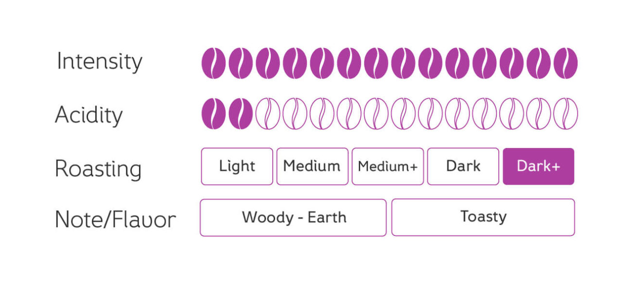 A bold expression of true Italian coffee mastery, created for those who crave depth and intensity. This dark roast offers woody and earthy aromas with a distinctive toasted bread flavor and a powerful 14/14 body intensity, pure, rich, and unforgettable.