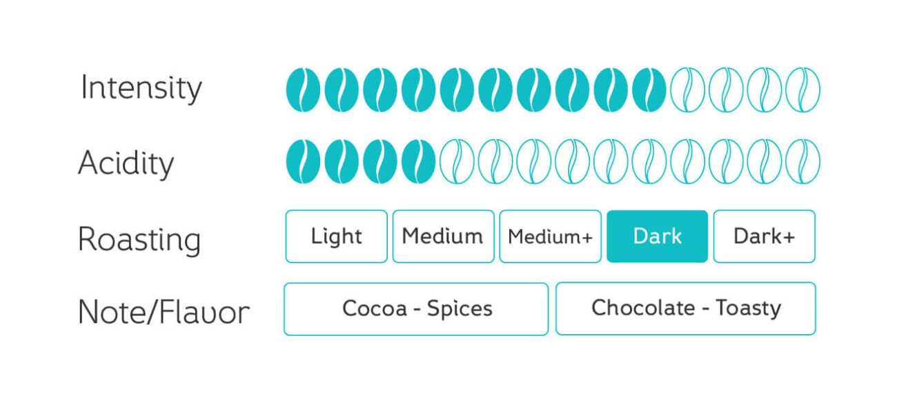 A harmonious blend of Robusta beans, expertly crafted through a unique preparation method that reveals an exotic and velvety taste. With rich notes of cocoa, spices, chocolate, and toasted bread, this blend embodies the energy and elegance of life itself.