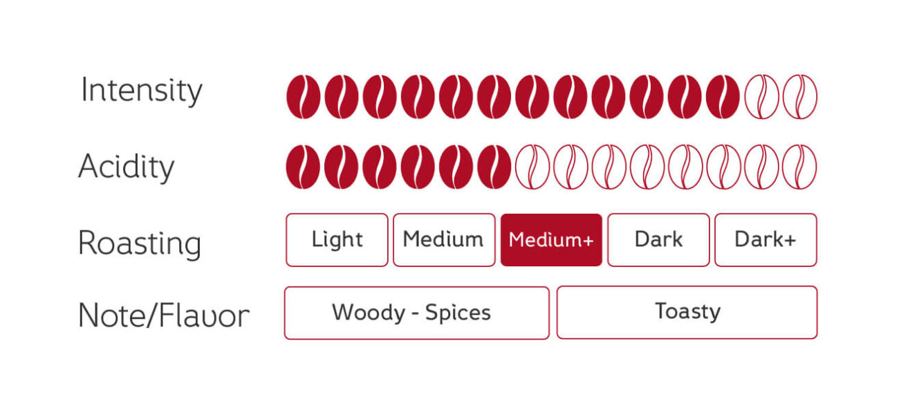 A bold and full-bodied roast made from premium Robusta beans, Italian-processed to perfection for an intense, rich espresso experience. With deep toasted notes and a lasting crema, it delivers a deep, toasted flavor with woody and spicy notes.